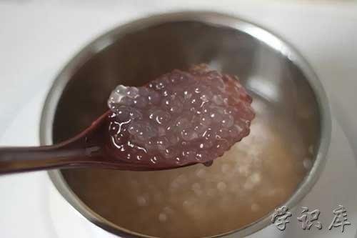 3、焖煮西米:等10~15分钟时间,西米心中出现小白点时,将火关了,盖上盖子焖几分钟的时间,直至西米中心的白点消失,说明西米已经熟透。