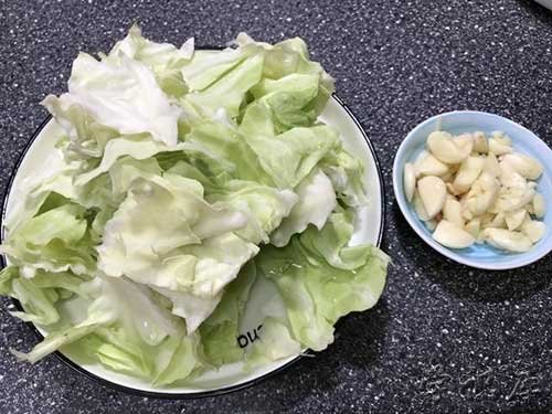1、大蒜拍扁,去皮,切成小块备用;包菜洗净后浸泡10分钟再撕成小块,包菜的梗靠近根部的地方会厚一些,用刀横切成薄片备用。