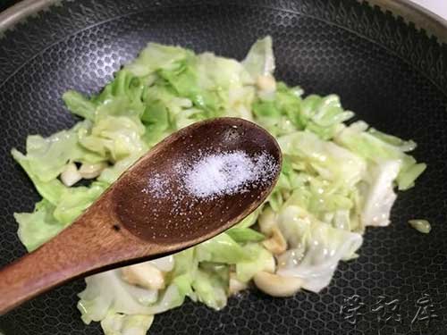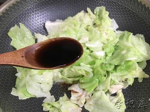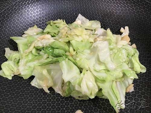 6、继续翻炒,大火快炒,可以保持包菜的口感清脆鲜嫩,这道菜很快就能出锅了。
