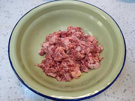 2、把羊肉放在案板上剁成肉末,放在盆中,加入5克盐搅拌均匀,让羊肉吸收盐分。做羊肉馅饺子,最好选用肥瘦相间的羊肉,吃起来鲜香味更足。
