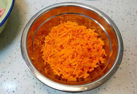 3、准备一小根胡萝卜,洗净后用擦丝器擦成细丝,然后再用菜刀剁碎。