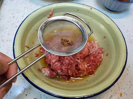 5、吸足花椒水的肉馅看起来会非常饱满,这个时候再加入5克左右生抽,继续搅拌均匀。