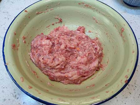 4、肉馅中加入盐以后再加入80克左右的花椒水,一边加水一边搅拌,让肉馅把水分完全吸进去。想要肉馅更好地吸收水分,一定要先加盐,让肉馅吸足盐分后才能更好地吸收水分。