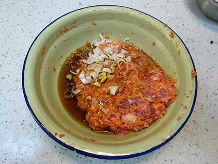 准备食材:羊肉300克、胡萝卜150克、葱花少许、姜末少许、干花椒2克、盐适量、生抽适量、胡麻油适量。