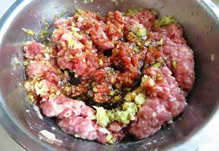 8、花椒油稍凉倒入肉馅中拌匀以便锁住水分肉馅更嫩。