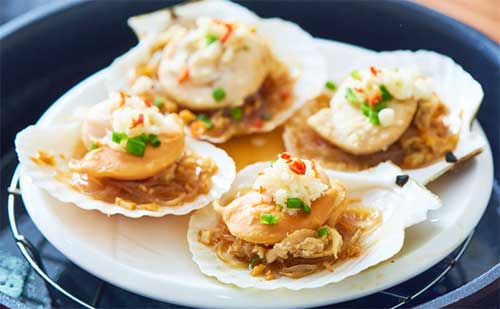 材料:鲍鱼2只、扇贝5只、葱姜蒜末适量、盐、白胡椒粉、生抽、料酒、糖、淀粉适量、植物油适量