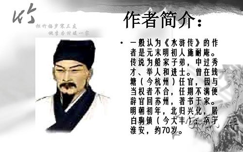 当然还有第四种说法,认为《水浒传》前头的一些部分是施耐庵创作、后头的部分是罗贯中续作的,这个说法出现的比较晚,是金圣叹在明末清初的时候提出来的,他认为七十一回以前是施耐庵写的古本,七十一回以后是罗贯中续作的,所以有这么四种看法。