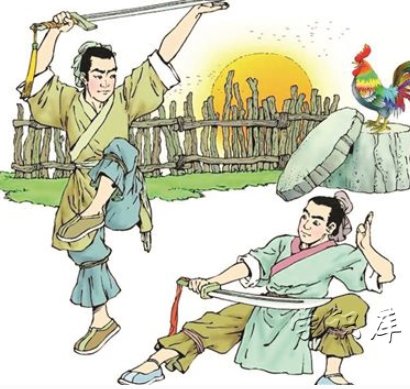 《晋书·祖逖传》记述:传说东晋时期将领祖逖他年轻时就很有抱负,每次和好友刘琨谈论时局,总是慷慨激昂,满怀义愤,为了报效国家,他们在半夜一听到鸡鸣,就披衣起床,拔剑练武,刻苦锻炼。