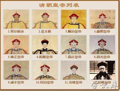 清朝历代帝王顺序为努尔哈赤(后金天命汗)、皇太极(后金天聪汗,改元为清后年号崇德)、福临(顺治)、玄烨(康熙)、胤禛(雍正)、弘历(乾隆)、永琰,后改顒琰(嘉庆)、绵宁,后改旻宁(道光)、奕詝(咸丰)、载淳(同治);、载湉(光绪)、溥仪(宣统)。