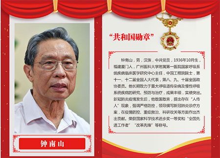 钟南山,共和国勋章获得者,我国呼吸疾病研究领域的领军人物,敢医敢言,勇于担当,提出的防控策略和防治措施挽救了无数生命,在非典型肺炎和新冠肺炎疫情防控中作出巨大贡献。
