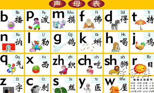 1、声母表有b、p、m、f、d、t、n、l、g、k、h、j、q、x、zh、ch、sh、r、z、c、s、y、w。