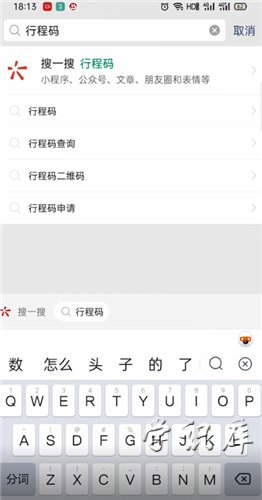 1、打开手机微信,点击发现,点击右上方的放大镜图标,在上面输入行程码。