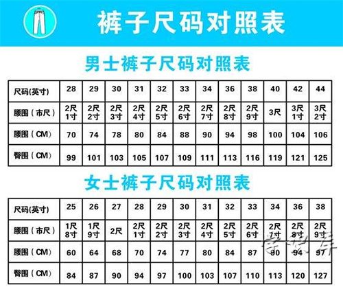 通常裤子尺寸的S、M、L、XL号代表着不同腰围:S号-29码,腰围2尺2;M号-30码,腰围2尺3;L号-32码,腰围2尺4;XL号-34码,腰围2尺5。衣服裤子上的尺码,如160/68A,160是指身高,68是胸围,A是关于体型的分类:A正常体、B偏胖、C肥胖体、Y偏瘦体。如L(170/92B)表示身高在170CM到175CM这间,胸围92左右体型偏胖的人可以选择这样的衣服。
