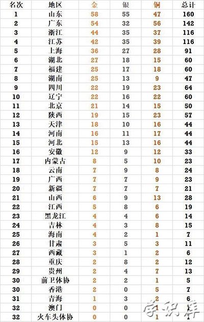 凭借皮划艇、摔跤、游泳等项目的4枚金牌,山东代表团顶住了广东的反扑,守住了金牌榜榜首之位,以58金54银47铜的成绩排名第1,实现了金牌榜四连冠的壮举。
