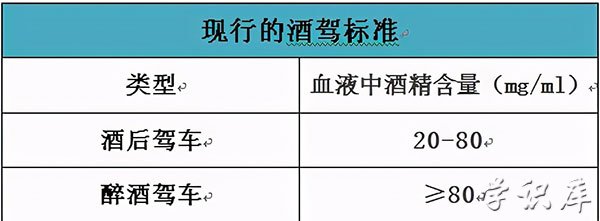 2023年根据国家质量监督检验检疫局发布的《车辆驾驶人员血液、呼气酒精含量阈值与检验》规定,驾驶人员每100毫升血液酒精含量大于或等于20毫克,并每100毫升血液酒精含量小于80毫克为饮酒后驾车;每100毫升血液酒精含量大于或等于80毫克为醉酒驾车。
