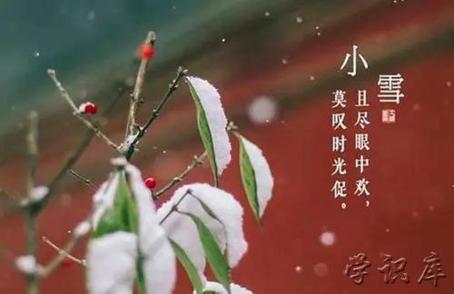 古籍《群芳谱》中说:“小雪气寒而将雪矣,地寒未甚而雪未大也。”这就是说,到“小雪”节气由于天气寒冷,降水形式由雨变为雪,但此时由于“地寒未甚”故雪下的次数少,雪量还不大,所以称为小雪。“小雪”是反映天气现象的节令。雪小,地面上又无积雪,这正是“小雪”这个节气的原本之意。小雪和雨水、谷雨等节气一样,都是直接反映降水的节气。