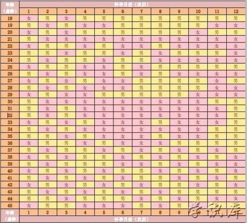 举个例子说明:如果妈妈在怀孕的时候是在农历的四月份,妈妈的农历生日是在十一月份。妈妈的虚岁年龄为26岁的时候,计算方法就是4月加上11月加上19月最后减去26月,最后得到的是8.表示的就是妈妈在2018年的农历一月预测会生出女孩。