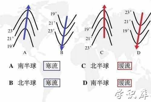 如下图所示,各条曲线表示的是海水等温线,在不说明方向时,默认“上北下南”。①A、B两条洋流都是从19℃流向23℃,为从低温流向高温,因此为寒流;C、D为从高温流向低温,为暖流;②A、D两条洋流,都是北侧水温高南侧水温低,因此为南半球;B、C为北侧水温低南侧水温高,为北半球。