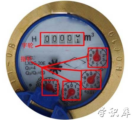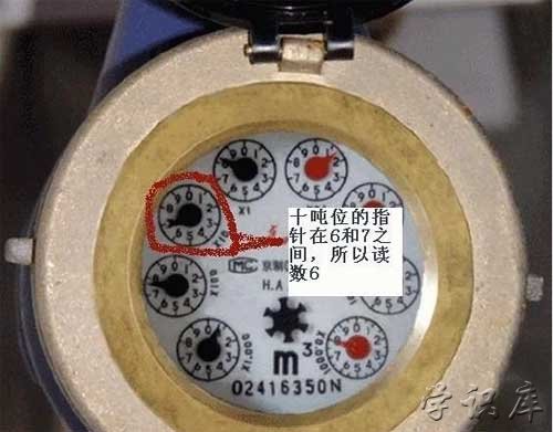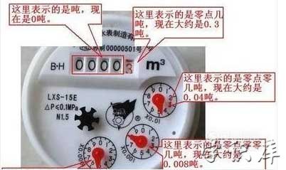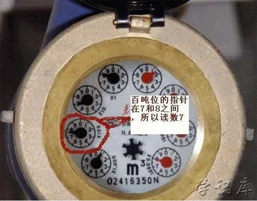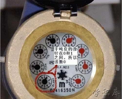 2、大家知道上图的指针式水表怎么看吗?先看千吨位,千吨位的指针在0和1之间,所以千吨位的读数为0;