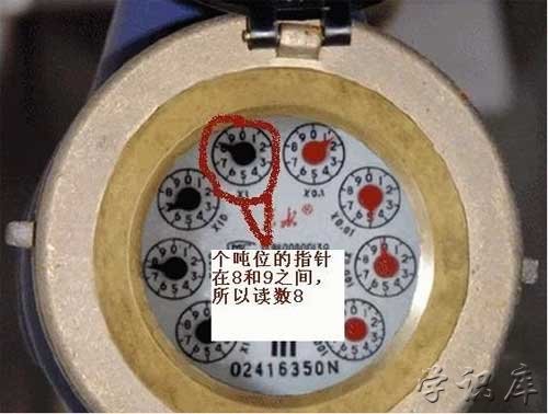认读水表时,要从高位指针向低位依次认读,即从×1000的指针示值标盘顺时针从下向上依次认读。特别需要注意:如果千位、百位、十位指针位置在两个数字之间时,要注意上下两个相邻指针与它的关联。“×10”的十位指针在8与9之间,非常靠近9,是该读8还是读9,取决于×1的个位标盘指针是否到0。