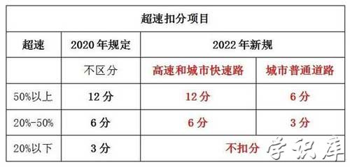 机动车超速规定放宽,在普通道路、高速和城市快速路上超速20%不扣分。新规中明确指出,机动车在高速和城市快速路上行驶低于最低规定时速扣3分。详细的扣分标准见下表: