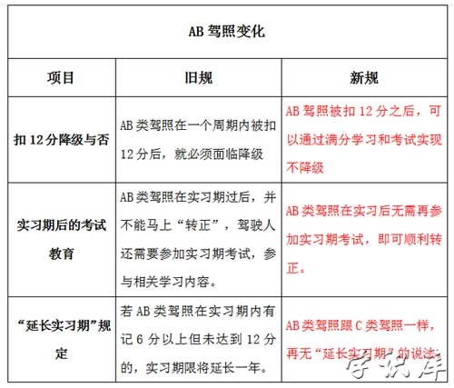取消AB驾照“扣12分降级”、实习期后的考试教育和“延长实习期”的规定。