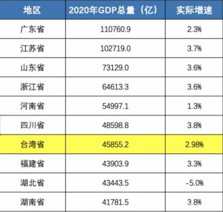 2020年中国GDP超百万亿,数据达到1015986亿元,台湾地区GDP为45855.2亿,我国同比增长为2.3%,而中国台湾增幅为2.98%,不仅超过了2019年的2.73%,还在30年来首次超过大陆的GDP增幅。
