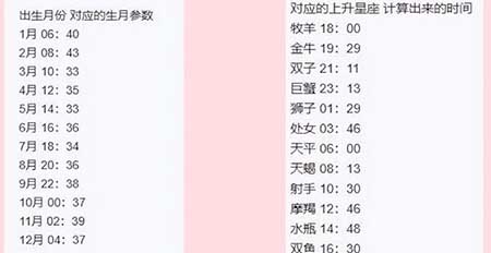 上升星座计算方法:出生月参数(见表一查询)+生日数字*4+出生时间=计算出的时间(见表二查询)便得出上升星座。