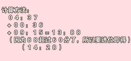 在总和中,如果超过“60分”,即进位到“时”,如果超过24时, 直接减24,进位到“日”。