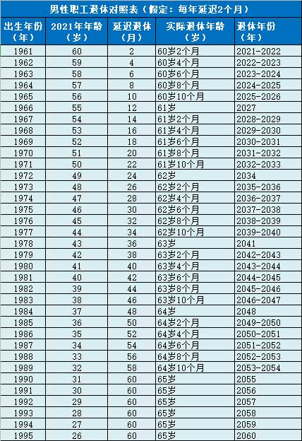 1、男性职工退休对照表