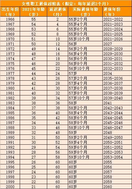 2、女性职工退休对照表