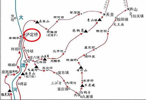 在1935年5月25日,中央红军部队在四川省安顺场强渡大渡河成功,沿大渡河左岸北上,主力由安顺场沿大渡河右岸北上,红4团第2连连长廖大珠等22名突击队员沿着枪林弹雨和火墙密布的铁索夺下桥头,并与左岸部队合围占领了泸定城。中央红军主力随后从泸定桥上越过“天险”,粉碎了蒋介石歼灭红军大渡河以南的企图。