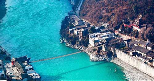 泸定桥又称铁索桥,康熙四十五年(1706年),泸定桥竣工之际,康熙皇帝亲自为该桥题写“泸定桥”桥名。大渡河自北向南,浪大水急,两岸谷壁陡峭,险峰兀立。泸定桥是大渡河上建造最早最长的一座桥梁。桥体分别由桥身、桥台、桥亭三个部分组成。桥身,由十三根铁索组成,是泸定桥的主要组成部分。东西桥台之间净跨100米、铁索长101.67米、桥宽2.7米,踏上桥面,整个桥身起伏荡漾,如泛轻舟,它是连接川藏交通咽喉之地。