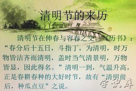 清明节大约始于周朝,大约已经有二千五百年的历史了,据传清明节始于古代帝王將相“墓祭”之礼,后来民间纷纷效仿,形成了现在固定风格的传统节日。清明也是一个很重要的节气,俗话说:“清明前后,种瓜种豆”,清明也正是春耕春种的大好时节。