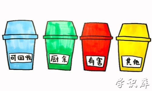 垃圾桶的分类四种分别是可回收垃圾、有害垃圾、厨余垃圾、其它垃圾。4种垃圾桶分别蓝色的可回收垃圾、黄色的其它垃圾、红色的有害垃圾和绿色的厨余垃圾,其中,其它垃圾也叫做干垃圾,厨余垃圾叫做湿垃圾。可回收垃圾主要包括废纸、塑料等可循环利用的废弃物,有害垃圾包括会对人体和自然环境产生损害的废弃物。