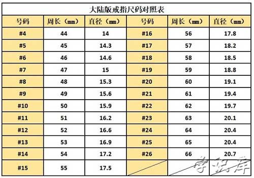 戒指尺寸对照表,我国戒指尺寸可分为4~24号,4号戒指对应的周长为44mm、直径为14.0mm,24号戒指对应的周长为64mm、直径为20.4mm。在购买戒指之前,可以先测量自己手指的尺寸。戒指尺寸可以用皮尺来测量,只需将皮尺围绕手指最粗的部位一圈,再读出皮尺尾端和顶头重合的数值即可。也可以用纸条或细绳缠绕手指一圈,重合部位做好标记后,用皮尺测量标记的部位就是戒指的尺寸大小。