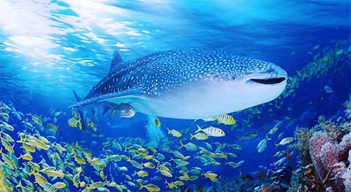鲸鲨性情温和,是目前世界上最大的鱼类,主要分布于各热带和温带海区,中国各海区夏、秋季节都有分布。鲸鲨拥有5对巨大的鳃,和一个宽达1.5米的嘴巴,其胸鳍可以长达4.8米,尾鳍则长达2.4米,呈新月状,上半部比下半部还长。皮肤厚度更为惊人,可达15厘米,能够有效抵抗其它生物的攻击。目前得到确认的最大鲸鲨早在1947年在巴基斯坦被发现,其体重高达21.5吨。