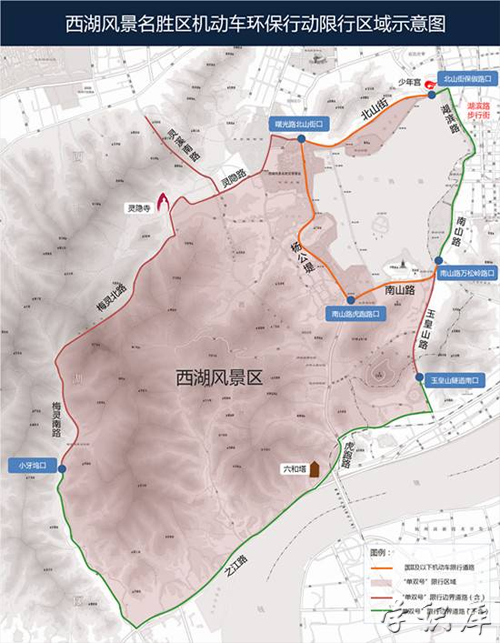 3.限行路段:北山街—环城西路—湖滨路—南山路—玉皇山路—玉皇山隧道—南复路—虎玉路(凤凰山路)—虎跑路—之江路—梅灵南路—梅灵隧道—梅灵北路—天竺路—灵隐支路—灵溪隧道(北至马家坞路口)—灵溪南路—灵隐路—玉古路—玉泉路—灵隐路合围区域内的道路。其中,北山街(保俶路—环城西路段)、环城西路、湖滨路、南山路(解放路—万松岭路段)、南复路、虎玉路(凤凰山路)、虎跑路(之江路至虎玉路)、之江路、梅灵南路(小牙坞—之江路段)不属此限。