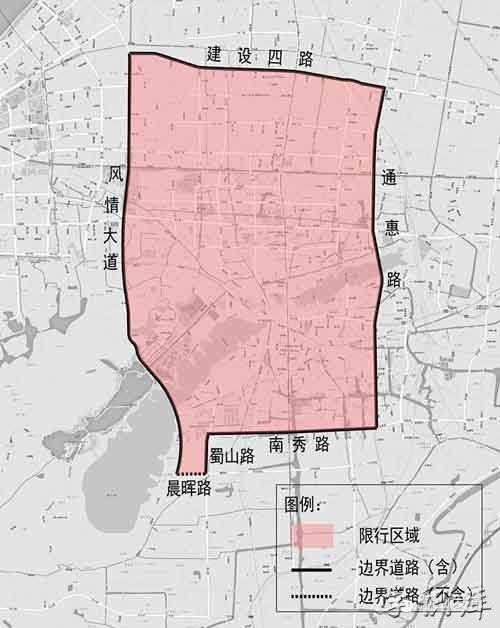 3.限行路段:建设四路、通惠路、南秀路、蜀山路、晨晖路、风情大道构成的围合区域内所有道路、高架、隧道,除晨晖路外其他围合道路均限行。