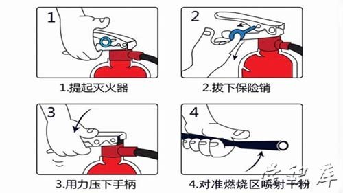 总结:使用前将灭火器颠倒几次让筒内的干粉松动,然后去掉灭火器的铅封,拔掉保险销,常常的是左手握着喷管,用右手提着压把,在距离火焰两米处的地方,右手用力压下压把,左手拿着喷管进行摇摆让喷射的干粉完全的覆盖在燃烧区,直到扑灭火灾为止。