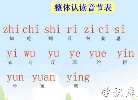 1.zhi、chi、shi、ri :这四个音节的韵母都是舌尖后元音“-i”,发音口形舌位不好掌握。把这四个音节当做整体来认读,是为了避开学习舌尖后元音“-i”的困难。