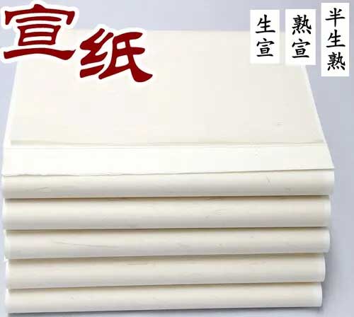 生宣是按照正常纸张制造程序而出产的宣纸。熟宣是在生宣基础上,再加上一层矾水。如果矾水的量比较少,又派生出所谓的半熟。