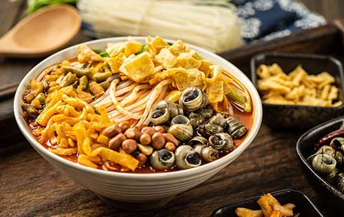 螺蛳粉是柳州最具地方特色的名小吃,螺蛳粉的味美还因为它有着独特的汤料,汤料由螺蛳、山奈、八角、肉桂、丁香、多种辣椒、等天然香料和味素配制而成。