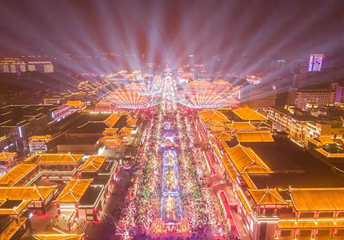大唐不夜城,位于陕西省西安市雁塔区的大雁塔脚下,北起大雁塔南广场,南至唐城墙遗址,东起慈恩东路,西至慈恩西路,街区南北长2100米,东西宽500米,总建筑面积65万平方米,是全国唯一一个以盛唐文化为背景的大型仿唐建筑群步行街,为当地地标性景区。