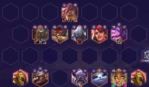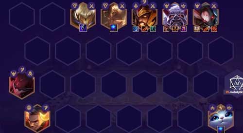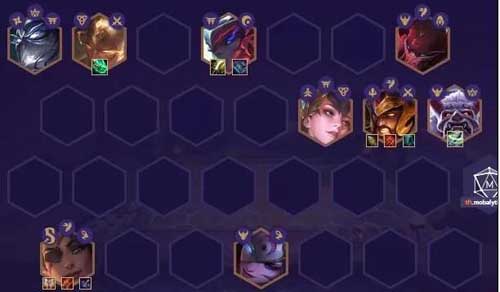 阵容组成:暮光之眼—慎、盲僧—李青、封魔剑魂—永恩、血港鬼影—派克、刀锋舞者—艾瑞莉娅、蛮族之王—泰达米尔、时光守护者—基兰、沙漠玫瑰—莎弥拉、战争女神—希维尔