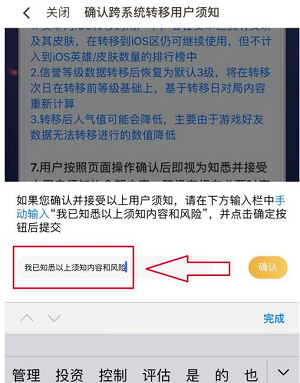 5、转移之前首先需要玩家确认转移的注意事项,确认完毕后将相应的确认术语填写进去点击后面的确认;