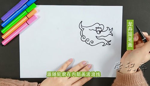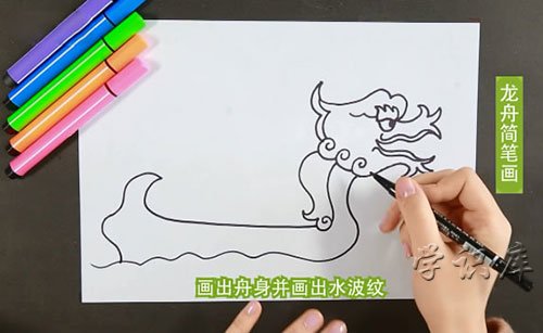 步骤三:接着用线条画出舟身,并用波浪线画出水波纹。