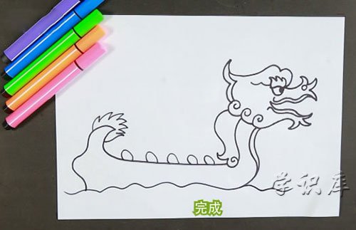 步骤四:用五个等大的弧线表示龙脊,最后点缀一下龙尾,龙舟就画好了。