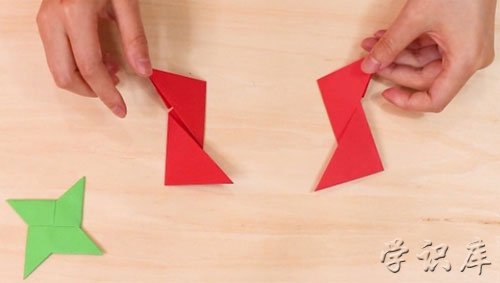 4、将这号的两部分已十字形式叠在一起,并将两个角塞到一起。