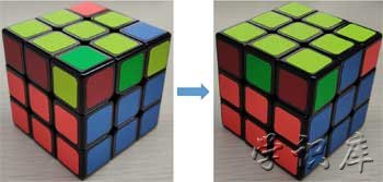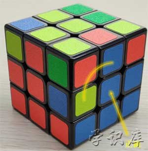 这一步就是还原中间一层的四个棱块(只关心棱块即可!!!!)。这一步的思想就是,先看顶面颜色(也就是顶面中心块的颜色),然后在顶层四个棱块中找没有这个颜色的,如果找到了,那就把第三层的棱块转到相应颜色的面上,再看顶面上这个块是什么颜色(只可能是左边面颜色或者右边面颜色),